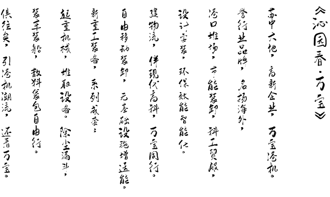 量身定制,港口、堆場,散體和粉體物料,裝船、堆高、輸送設(shè)備,工藝設(shè)計、設(shè)備制造 和安裝調(diào)試。提供整體解決方案和技術(shù)支持。提供全新的港口裝卸理念,輕松擴大港口經(jīng)營范圍。